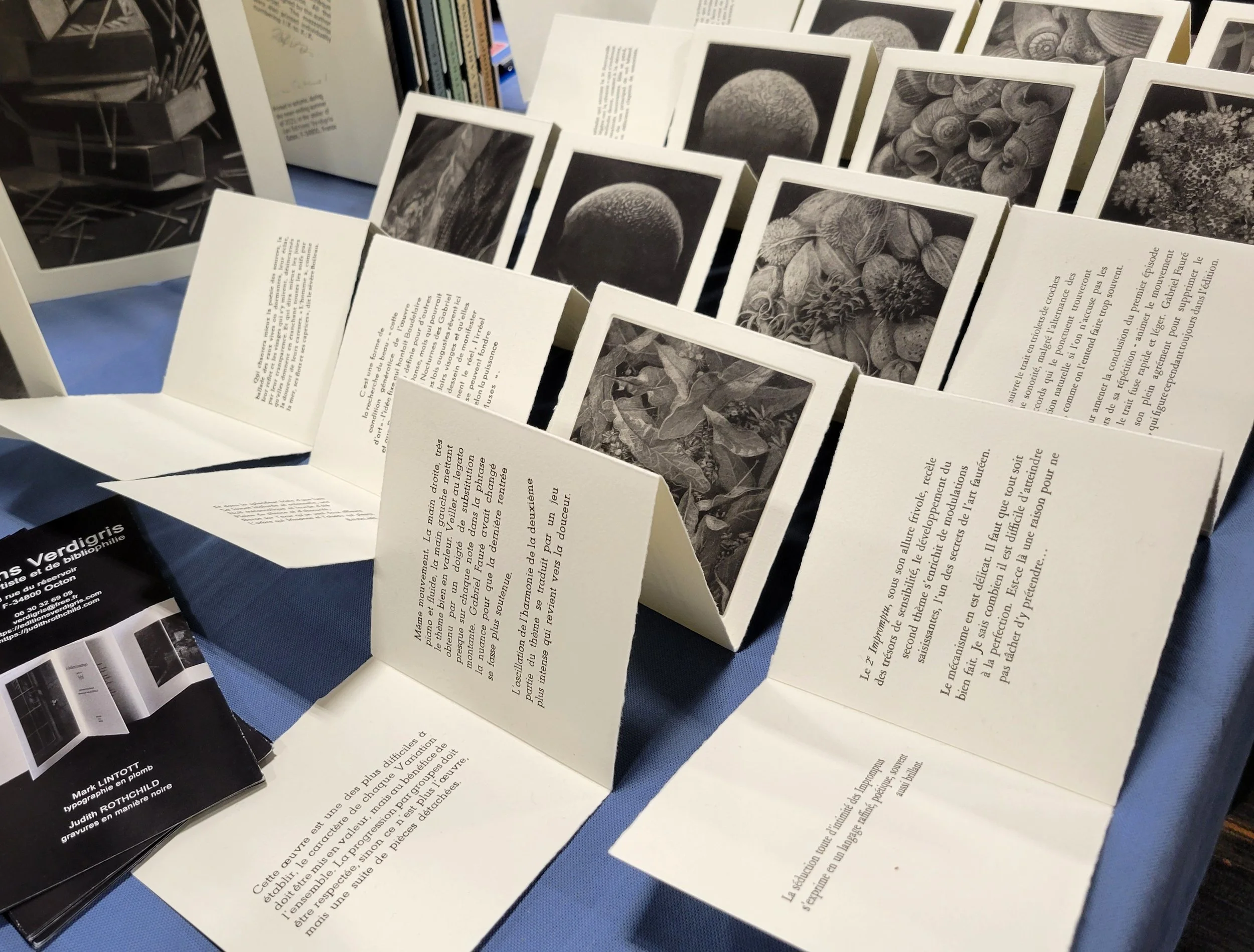 Sonatine, a collection of 14 mezzotints by Judith Rothchild with text from Au piano avec Gabriel Faure by Marguerite Long. The letterpress and construction of the book were accomplished by Mark Lintott and the marbled papers are the work of Marie-Anne Hermaide. SPECIAL ORDER ONLY - ALLOW 8-10 WEEKS for delivery